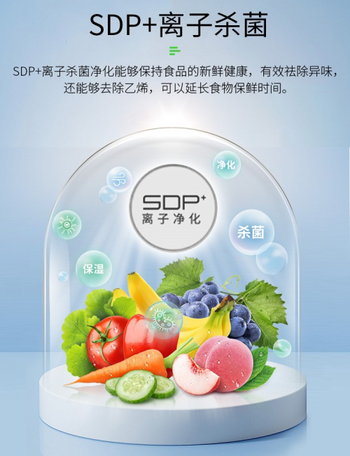 同时,产品内置SDP+高效除菌净味系统,可有效抑制大肠杆菌、金黄色葡萄球菌等常见细菌滋生,除菌率达99%以上,同时吸附柜内异味分子,杜绝食材串味问题。从“锁鲜”到“护鲜”,全方位守护家庭食材健康,为老人、儿童等敏感人群提供更安心的储鲜环境。