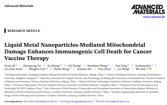 近日,北京中医药大学第二临床医学院(东方医院)周天主任医师团队联合中国科学院理化技术研究所饶伟研究员团队、国家纳米科学中心王磊研究员团队,在治疗性癌症疫苗与癌症免疫治疗方向取得新进展,研究论文“Liquid Metal Nanoparticles‑Mediated Mitochondrial Damage Enhances Immunogenic Cell Death for Cancer Vaccine Therapy”发表于Advanced Materials(中科院1区,JCR 1区,IF=26.8)。该研究提出“液态金属纳米颗粒(LMPs)+不可逆电穿孔(IRE)”的组合策略,为提升原位肿瘤免疫应答与建立长期免疫记忆提供了新的思路。