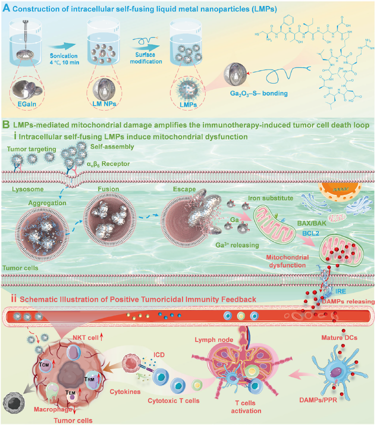 本研究创造性的解决了纳米递送体系长期存在的“尺寸两难”问题——小颗粒易进入但不易久留,大颗粒易久留但难进入。研究者利用液态金属材料特性与肽修饰设计,使LMPs在肿瘤细胞表面受体介导下增强摄取,进入溶酶体后在酸性/酶环境中发生自融合,实现“先小后大”的胞内尺寸跃迁,形成更持久的细胞内滞留与持续释放库,为实现持续线粒体应激与ICD放大提供了结构与物质基础。