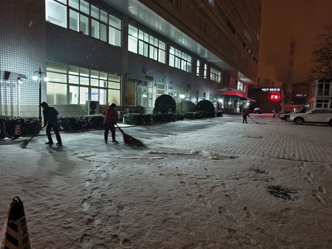 雪情即是命令,畅通便是责任。凌晨时分,当大多数人还在温暖梦乡,医院总务处联合保卫处的后勤员工已顶风冒雪集结到位,打响了扫雪铲冰攻坚战 。他们手持铁锹、挥起扫帚,在门诊大厅入口、住院部通道、主干道等关键区域弯腰奋战,针对结冰路面反复铲凿,即便双手冻得通红,依旧脚步不停。寒风吹不散热忱,积雪挡不住坚守,他们以“雪落即清、路见本色”为标准,人机协同高效作业,只为在医患出行前扫清障碍。