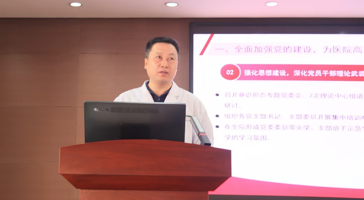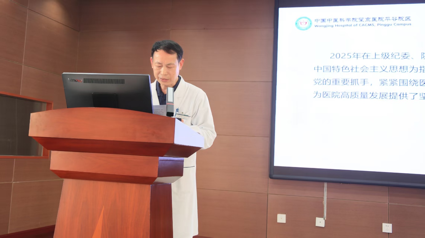 随后,党委书记周自广作2025年度党建工作报告。报告以习近平新时代中国特色社会主义思想为指导,全面阐述了平谷院区在组织建设、思想引领、队伍培育等领域的丰硕成果,重点突出党建与中医药业务深度融合的实践路径,为新一年以高质量党建引领高质量发展指明了清晰方向,推动党建优势持续转化为发展动能。