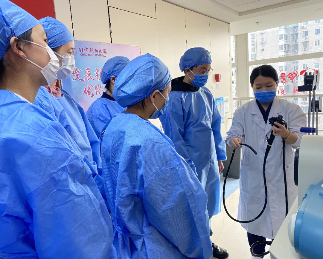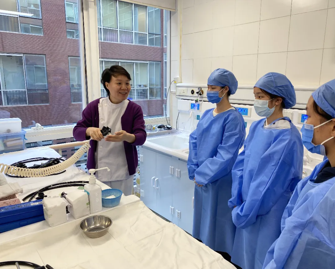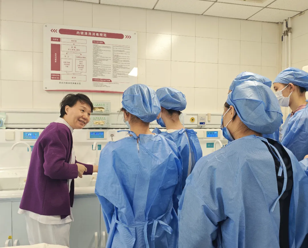 沉浸式参观与体验环节成为整场活动的高光时刻。在内镜中心护士长高颖新的专业引导下,同学们分批走进内镜中心,实地观摩工作环境。高颖新严谨细致地讲解了内镜消毒灭菌的全流程,让同学们深刻体会到医疗安全领域不容丝毫懈怠的责任担当。在模拟操作区,郭怀珠耐心指导同学们尝试内镜基础操控。同学们纷纷表示:“操作虽然不易,但亲手触摸这些仪器的瞬间,让我对医生这个职业有了更具体、更真切的想象。”