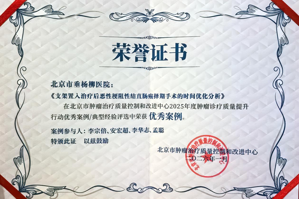 近日,在北京市肿瘤治疗质量控制和改进中心组织开展的2025年度肿瘤诊疗质量提升行动优秀案例与典型经验评选中,由清华大学附属垂杨柳医院普外科副主任医师李宗倍申报的《支架置入治疗后恶性梗阻性结直肠癌择期手术的时间优化分析》项目荣获优秀案例。