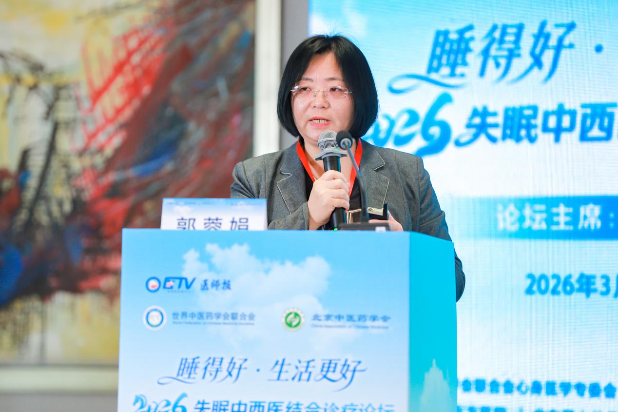 第三位讲者是本次论坛主席、来自北京中医药大学第二临床医学院(东方医院)的郭蓉娟教授,她的报告题目为《失眠障碍中西医结合防治策略》。郭教授以中医“心身合一”整体观为纲,构建了失眠的中西医结合防治体系,创造性地将西医“3P模型”与中医“营卫失和、阴阳失调、神不守舍”病机理论融合,提出“医患联盟、形神并调”的总原则。在“调神”层面,她强调通过认知行为调整与正念练习破除对睡眠的执念;在“调形”层面,她推行“白+黑”中药治疗方案,即白日方治本调“昼不精”,夜间方治标促安眠,并系统引证了针灸、中医功法、耳穴等多种非药物疗法的循证依据。她总结指出,应基于患者情况灵活运用中医、西医或中西医结合策略,发挥中医个体化、形神同调、疗法多样的优势,最终实现心身痊愈。
