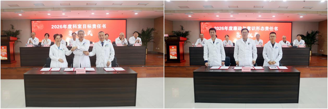 会议第一个环节是责任书签署仪式。医院院长张新庆分别与科室代表李薇(神经内科主任)、崔健(胸外科主任)签订了2026年度目标责任书。党委书记吴兴海分别与科室代表徐执扬(创伤骨科(骨一科)主任)、王贺(政策研究与宣传办公室主任)签订了党风廉政与意识形态责任书。责任书明确了年度工作考核指标、党风廉政建设责任要求,既是一份责任清单,也是一份承诺担当,通过层层压实责任,形成“医院—科室—个人”三级责任传导体系,推动各项工作责任到人、任务到岗,切实把思想和行动统一到医院整体发展部署上来,为全年工作有序推进提供坚实保障。