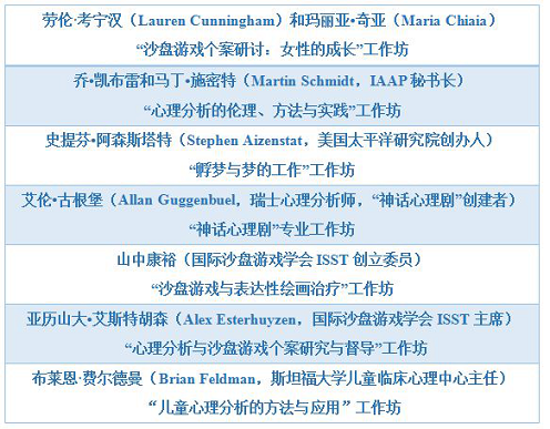 众多国际著名心理分析大家齐聚也为国内心理分析的学习者、从业者提供了难得的机会,涵盖了各种心理分析技术和专题的会前工作坊是近几届心理分析与中国文化国际论坛的特色, 此次会前也将有7场精彩的会前工作坊,内容包括神话心理剧技术、沙盘游戏治疗、梦的孵化技术等: