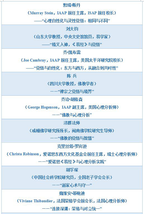 国际分析心理学会前任主席、瑞士著名心理分析师默瑞•斯丹(Murray Stein)做大会主题演讲——有关禅宗十牛图所寓意的觉悟与自性化过程;中国中央文史馆馆员,山东大学刘大钧教授,将从“觉悟”来阐释《易经》中的智慧与天人合一的境界;济群法师、四川大学教授陈兵将带来佛教中有关觉悟的精彩讲解;国际沙盘游戏治疗学会(ISST)的主席亚历山大,易斯特胡森等等国际著名沙盘游戏治疗师则会在大会上呈现自性化在沙盘游戏中的显现。IAAP现任主席玛瑞安·穆勒、副主席乔治·胡格森、前任主席乔·坎布雷、法国荣格学会前会长魏维安·蒂鲍迪、爱诺思东西方文化基金会前任主席克里丝塔·罗宾逊、美国旧金山荣格学院前院长约翰·比毕等诸多资深心理分析师、哲学家、心理学家、汉学家以及吴怡、胡孚琛、申荷永等中国文化的资深学者,都将围绕“觉悟与自性化”,展开东方与西方的对话。