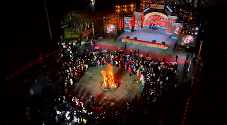 演出尾声的篝火环节将氛围推向高潮。火焰腾起后,人群自发围成圆圈,有人跟着节奏拍手,有人拉着孩子绕火奔跑,穿着高跷的表演者穿梭其间引来阵阵喝彩。火光映照下,返乡青年与本地居民相遇寒暄,“回来了就好”“明年也要回来”等朴素话语格外真切,篝火成为连接乡情的情感纽带。