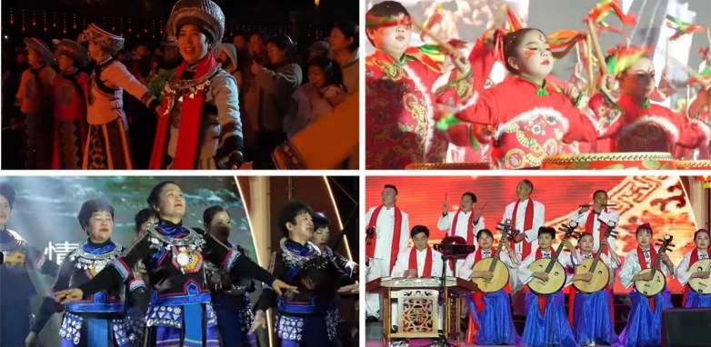 节目内容突出群众性与年俗味,群舞、器乐、合唱等轮番登台,演员既有文艺队伍,也有本地群众参与。民族服饰与民俗元素的融入尤为亮眼:不同年龄段演员同台互动,青少年表演者身着节日盛装在聚光灯下认真完成动作,台下家长举起手机记录“高光时刻”,现场掌声与欢呼此起彼伏。