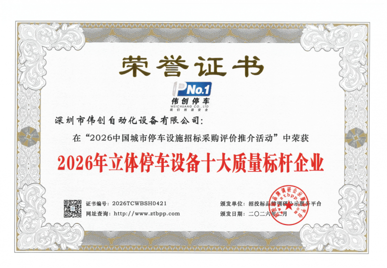 近日,在城市化进程加速、停车难题日益凸显的行业背景下,招投标品牌调研公示服务平台主办的“2026中国城市停车设施招标采购评价推介”活动圆满落幕。深圳市伟创自动化设备有限公司(以下简称“深圳伟创”)凭借深厚的技术积淀、雄厚的企业实力与卓越的品牌影响力,在众多参评企业中脱颖而出,一举斩获“2026年立体停车设备十大领军企业”“2026政府采购立体停车设备十大品牌”“2026年办公项目立体停车设备前三强”“2026年市政公共项目立体停车设备前三强”“2026年医院项目立体停车设备前三强”“2026年城市级智慧停车平台十大品牌”“2026年立体停车设备十大质量标杆企业”等多项重磅荣誉,用实力诠释行业标杆地位,这份殊荣更是对其多年来深耕立体停车设备领域、坚守创新初心、践行品质承诺的最高肯定。
