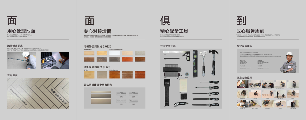 天格的高端实木地板不是一个单一的产品概念,其内涵除了产品本身的高端品质表现,还包含了面面俱到的服务、总部负责的安装和五大承诺的保障这一整个服务保障体系。面面俱到的服务管理体系,提供了标准化的操作流程和专业的配套工具,让地板的安装工作更为标准化的、专业化。总部负责的安装,则为其提供了专业人才和先进模式,从地板选购到安装结束,全链路消费环节都由天格总部进行直接负责,真正实现“成品交付”。而五大承诺的用户保障体系,覆盖“售前-售中-售后”,让用户充分感受到“家居地面消费全寿命周期系统解决方案”的保障价值所在。功能的使用价值和服务的保障价值,构成了天格“高端”实木地板的核心所在。